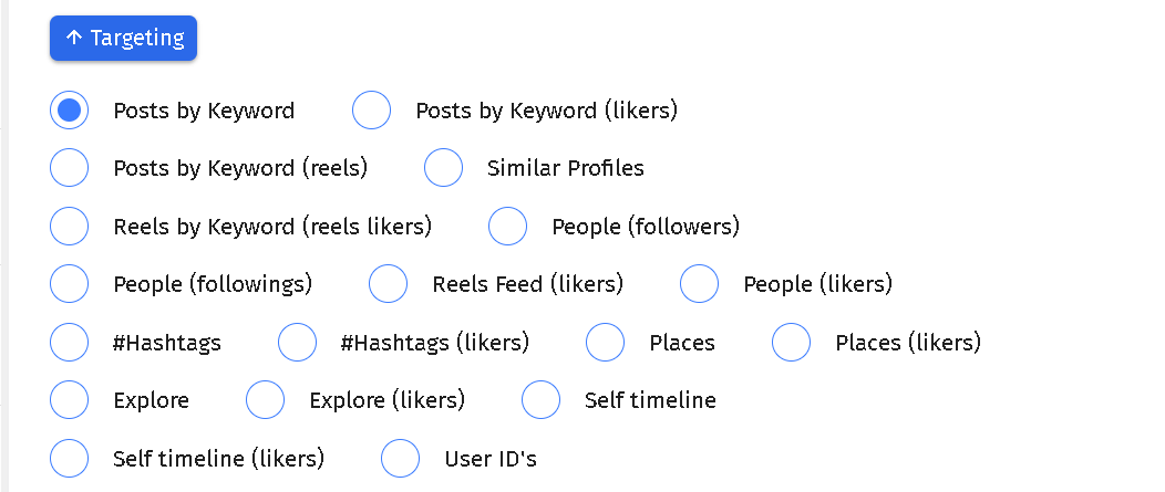 10. **#Hashtags (likers)**: Targets users who like posts that contain specific hashtags.