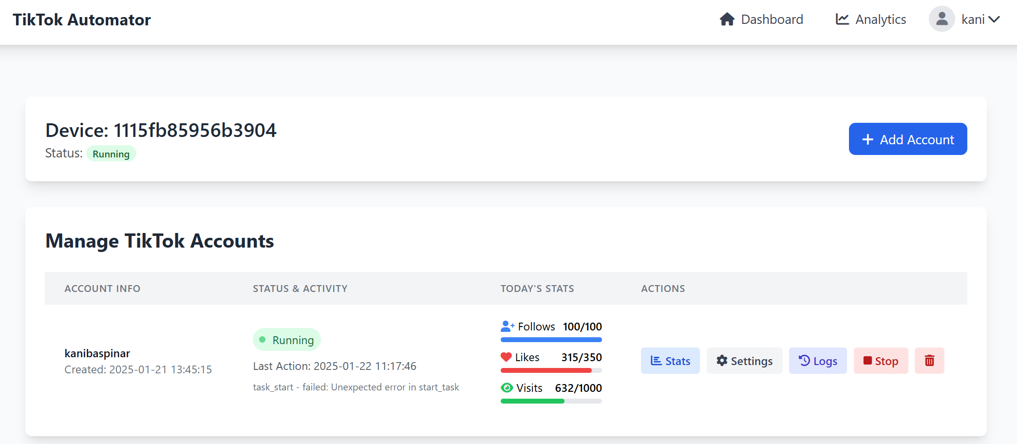 * The account `kanibaspinar` is **Running**, but the last action (`task_start`) failed due to an unexpected error. This indicates a potential issue that needs to be addressed.